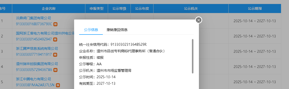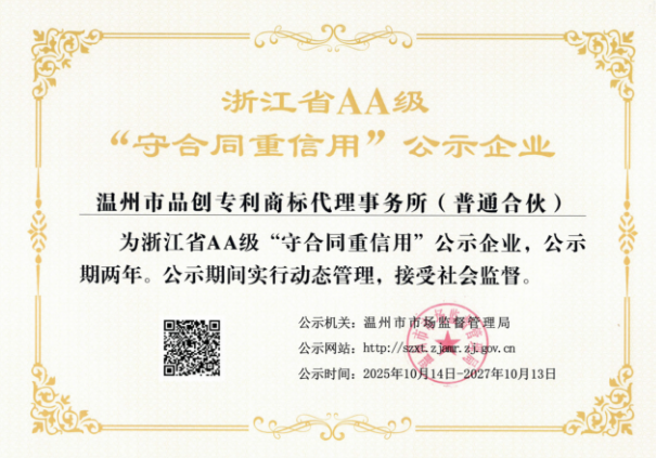 近日,温州市品创专利商标代理事务所获评为2025年浙江省AA级“守合同重信用”公示企业。