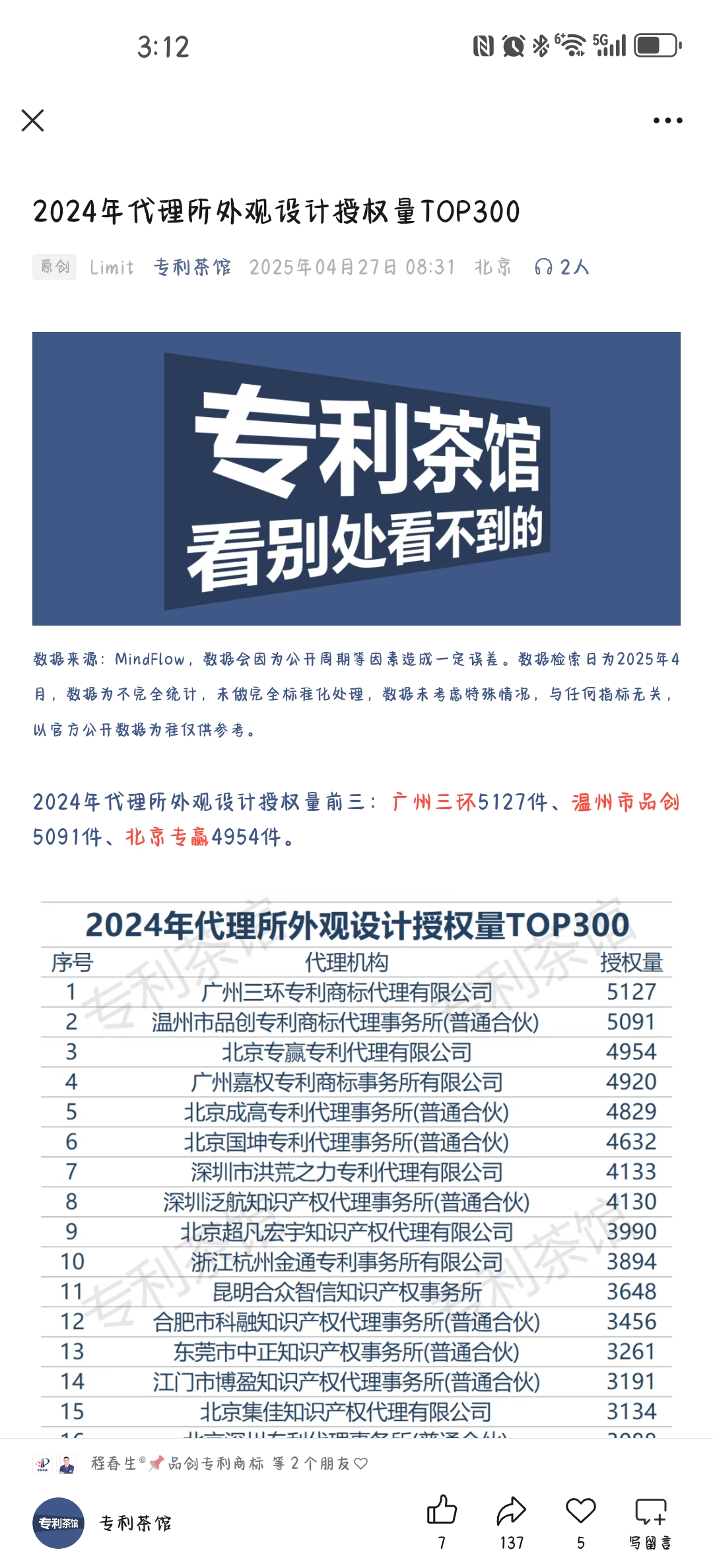 2023年全国外观专利代理量第二名